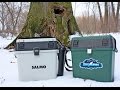 Rapala — хорошо продуманная планировка, возможность менять отсеки на свое усмотрение благодаря наличию съемных разделителей, теплоизоляционное покрытие стенок, высокая прочность, позволяющая использовать изделие в качестве сидения (в том числе и пенопластовые), надежный транспортировочный ремень.- Salmo — выполнены из морозоустойчивых материалов, не бояться ударов, кроме стандартного ремня оснащены специальными петлями для переноски на спине (как рюкзак), высота большинства моделей 39 см, поэтому сидеть на них удобно и комфортно.